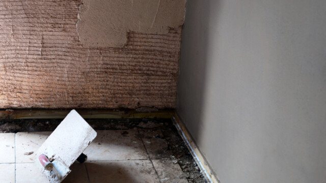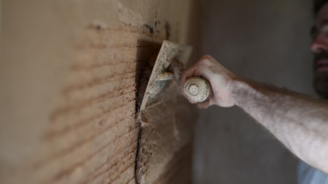 A house in Mere. The original internal wall had been rendered with cement. This non breathable mortar had caused a build up of moisture which in turn created a damp patch. Luke knocked the cement render off and re-plastered the wall with lime.